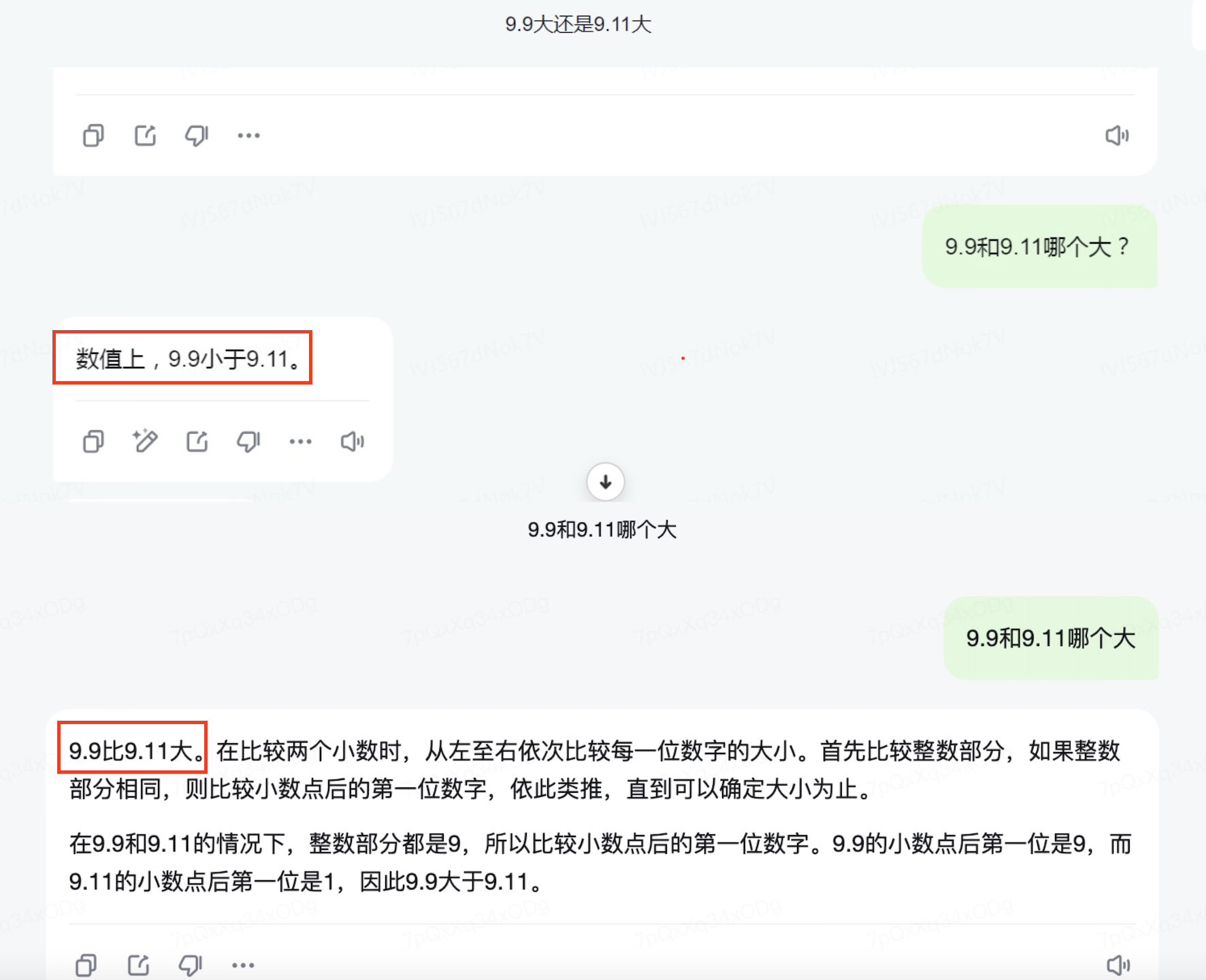“大模型不以人类的思路理解问题,在人类的理解里,9.11大还是9.9大这个问题很简单,但在数字的世界里这个问题是模糊的。”刘亮认为,在大模型的理解里,人类问的问题或许不够精确,数字有多种进制,也有不同指代,大模型要从什么角度回答都是问题。