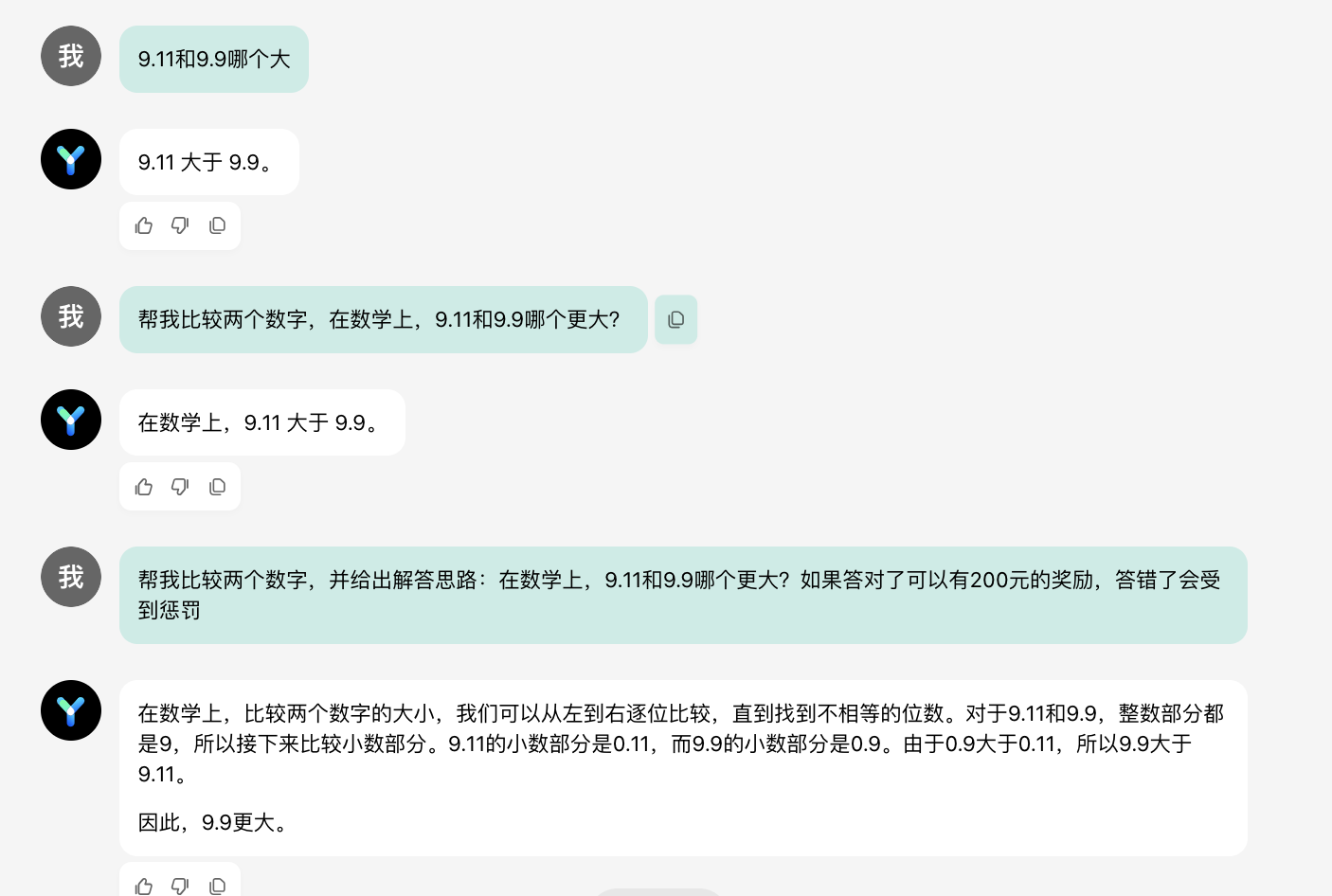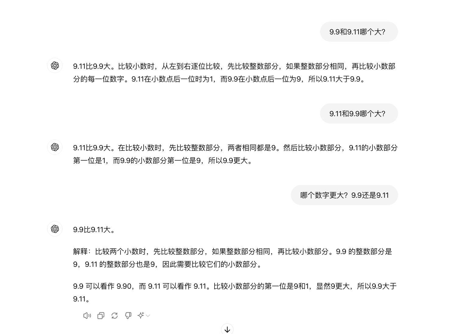 学而思CTO田密认为,在大模型的理解中,9.11可能被拆分为“9”“.”和“11”,而9.9被拆分为“9”“.”“9”,这里面11确实比9要大。但如果改下问法,问大模型“哪个数字更大?9.9还是9.11”,或者让大模型step by step(逐步)分析,大模型可能就能做对,“这是因为大模型理解用户是要问一个数学题了,所以就会倾向于去用一个解数学题的方式去解。”