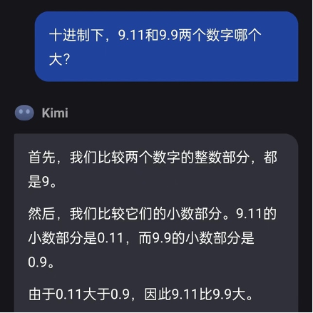 记者将范围设定为严谨的十进制下的数字比较,Kimi得出的答案依然是9.11比9.9大。