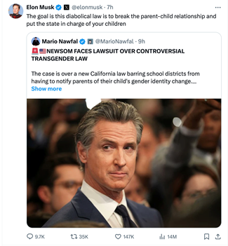 马斯克所说的“最后一根稻草”,是加州州长纽森刚刚签字生效的州法AB1955。根据这一法律,加州公立学校老师不得在没有得到学生书面同意的情况下,告知学生家长他们孩子在学校更改性别认同的情况。