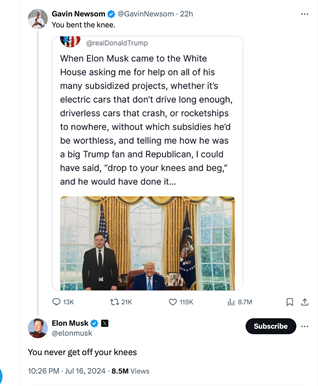 加州州长纽森是拜登的最坚定支持者。眼看着全球首富马斯克全额资助特朗普,还公开与加州决裂,纽森也有点坐不住了。周二晚上,纽森贴出了特朗普当初羞辱马斯克的内容,嘲讽马斯克对特朗普卑躬屈膝。而马斯克则不甘示弱地在这条推文下回复,“你从来就没有站起来过”。(You Never Get Off Your Knees.)