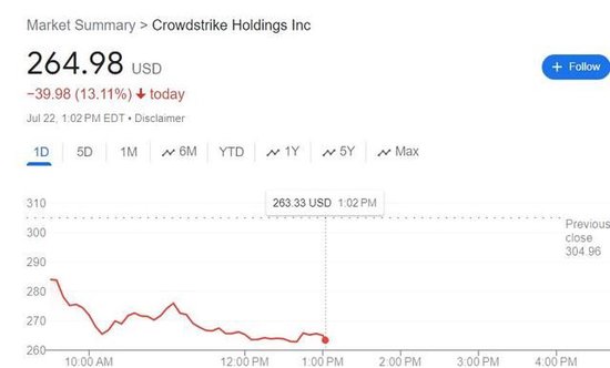 上周引发全球IT系统大宕机后,网络安全公司CrowdStrike股价继续暴跌。美东时间7月22日周一,CrowdStrike低开6.5%,开盘半小时左右跌幅即扩大到10%以上,午盘刷新日低至261.59美元,日内跌超14%,后保持10%以上跌幅,势将继上周五之后连续第二个交易日收跌超10%,或将刷新上周五所创的2022年11月以来最大跌幅、并刷新1月8日以来收盘低位。