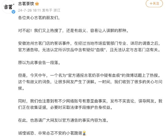 7月26日,古茗官微回应疑产品有血痰事件称,经过当地市场监管部门专业、详尽的调查之后,官方通告称,无法认定所诉饮品中含有疑似“血痰”,且无法认定与古茗门店有关。但如今有不少网络账号有意歪曲事实,发布不实言论,误导网友。我们正在收集证据,必要时采取法律手段维护自身权益。