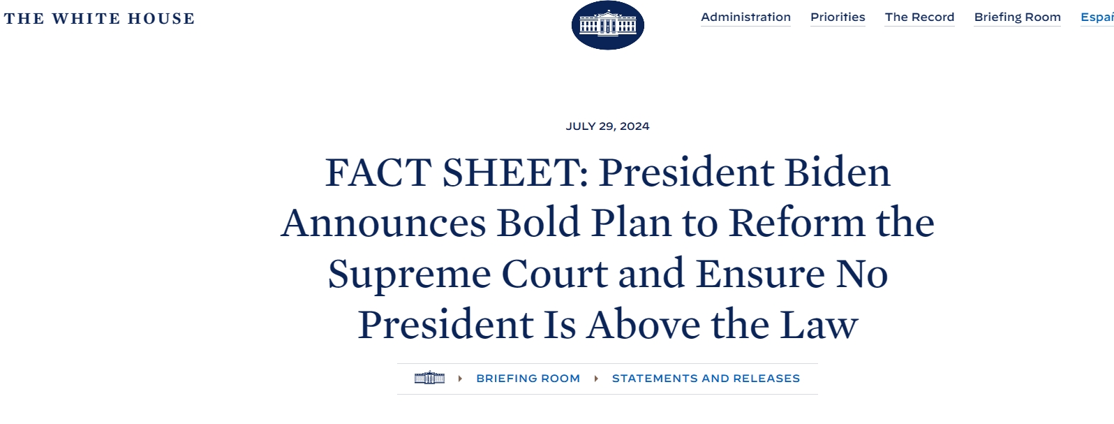 当地时间周一(7月29日),美国白宫官网发表声明,总统拜登宣布了对联邦最高法院进行紧急改革的计划,这也是拜登剩余任期内的工作重点。拜登的改革计划主要是为了限制最高法院九名大法官的权力,该计划要求对大法官进行任期限制,并支持实施具有约束力的职业道德规范。