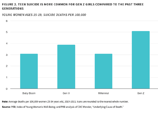 美国人惊恐地发现,和前几代人相比,Gen Z一代变得越来越社恐和死宅。这些青少年不愿意出去打工,拿驾照年龄也更晚,甚至还不想出去玩(一个间接影响是,连未成年怀孕率都只有千禧一代的三分之一),成家生育年龄越来越晚,甚至很多人压根不想要孩子。更令人担忧的是,Gen Z的自杀率却远远超过前几代人。Gen Z女孩的自杀率高达每10万人5.1,而千禧一代只有3.1。