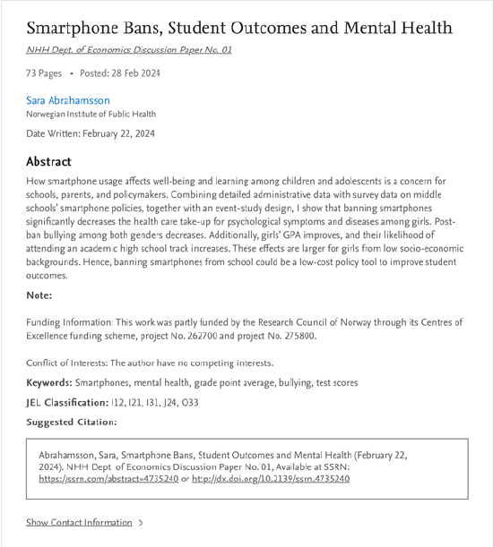 挪威学者今年年初的一项调查显示,中学生禁用智能手机之后,女孩的学习成绩和心理健康都得到了显著提升,而且霸凌事件也减少了。他们的调查还发现,在低收入家庭的孩子中,校园禁用手机起到的正面效果更为明显。