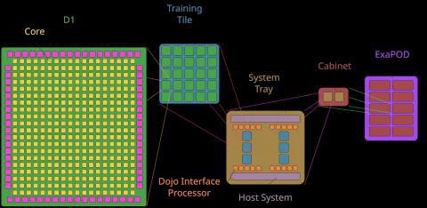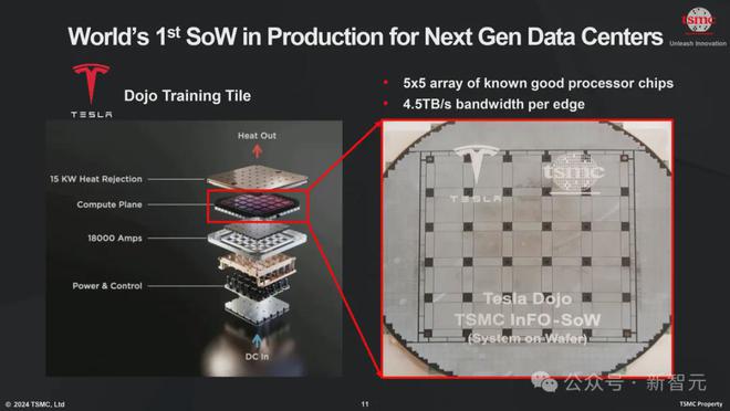 每个tile拥有9 petaflops的算力,以及每秒36 TB的带宽,并包含电力源、冷却和数据传输硬件。