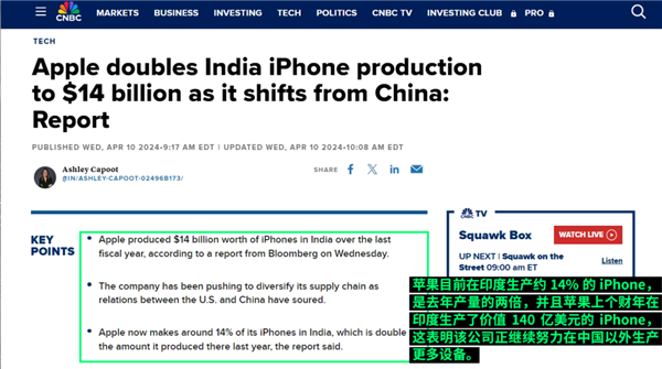 为了避免陷入一家之言,托尼又找到了 24 年 4 月份美国消费者新闻与商业频道 ( CNBC ) 上的报道。
