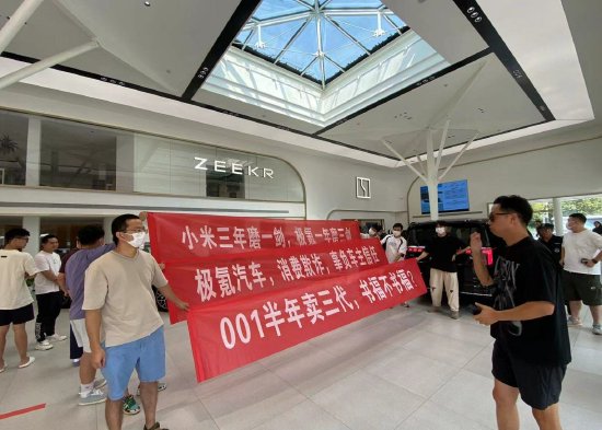 另外,还有汽车博主晒出极氪车主前往线下门店拉横幅维权的图片,横幅上称“小米三年磨一剑,极氪一年磨三剑。极氪汽车,消费欺诈,辜负车主信任。001半年卖三代,书福不书福!”