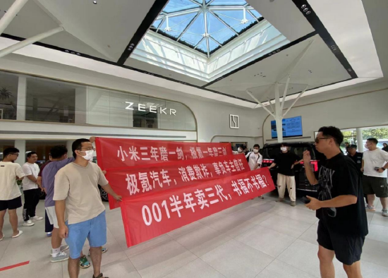 另外,还有汽车博主晒出极氪车主前往线下门店拉横幅维权的图片,横幅上称“小米3年磨一剑,极氪一年磨3剑;001半年卖三代,书福不书福?”