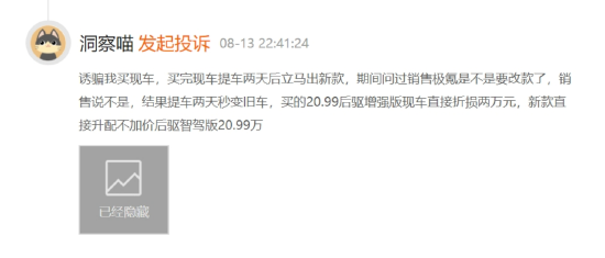 不过,依然有大量老车主在互联网上开启维权模式。新浪科技在黑猫投诉 【下载黑猫投诉客户端】上看到,8月13日的发布会后,关于极氪的投诉量大增。一位车主投诉称,买完现车提车两天后立马出新款,其间问过销售极氪是不是要改款了,销售否认,结果“提车两天秒变旧车”,“买的20.99后驱增强版现车直接折损两万元,新款直接升配不加价后驱智驾版20.99万”。