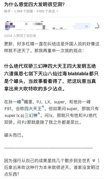 知乎平台上,质疑四大发明的也有不少。有人甚至直接说,“都只是个噱头,当故事看看得了。”“因为强行从自己的成果里找几个散布到全世界后,拿出来吹这种行为本来就很逆天。谁家没发明过点东西?”