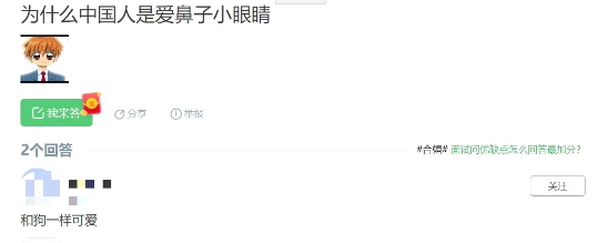 谈到智商问题,有的回答者认为,长期生活在较文明较进步的环境里的人种智商较高。有人在提问中对中国人的外貌进行调侃,语气看起来并不友好。比如,有人问,为什么中国人是矮鼻子小眼睛?还有人在回答中称,“中国人的特色是小眼睛。”