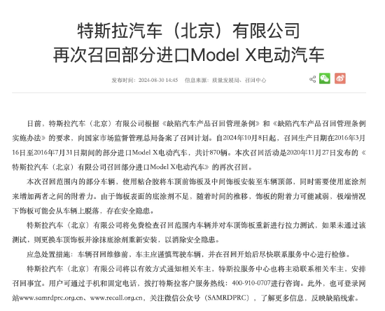 自2024年10月8日起,召回生产日期在2016年3月16日至2016年7月31日期间的部分进口Model X电动汽车,共计870辆。本次召回活动是2020年11月27日发布的《特斯拉汽车(北京)有限公司召回部分进口Model X电动汽车》的再次召回。