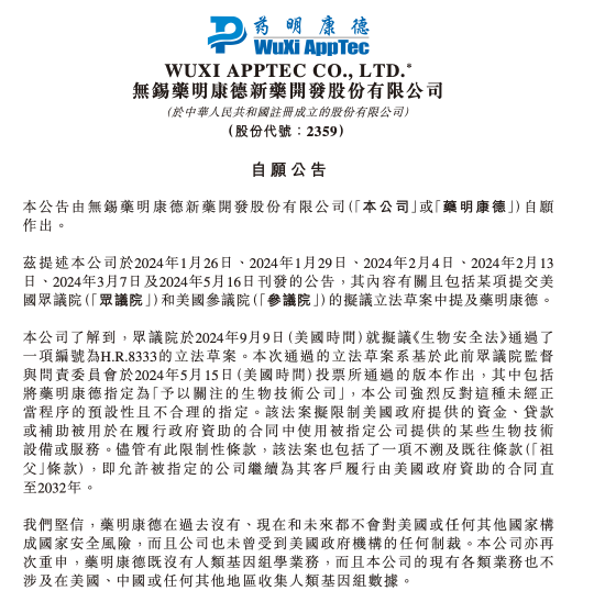药明康德就美众议院通过《生物安全法》做出回应称,本公司了解到,美国众议院于2024年9月9日(美国时间)就拟议《生物安全法》通过了一项编号为H.R.8333的立法草案。