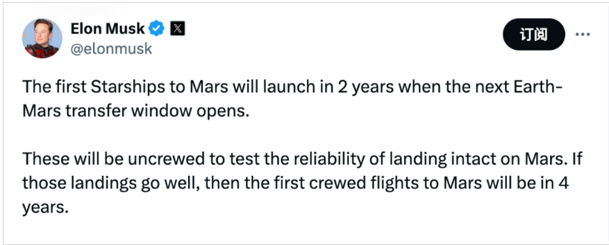 马斯克写道,这些飞船将是无人驾驶的,以测试在火星上完整着陆的可靠性。他补充称,如果它们顺利着陆,那么SpaceX将在四年内首次向火星发射载人飞船,这将是一个关键节点,因为自那时起飞船的发射率将呈指数级增长。