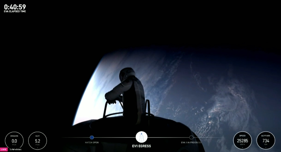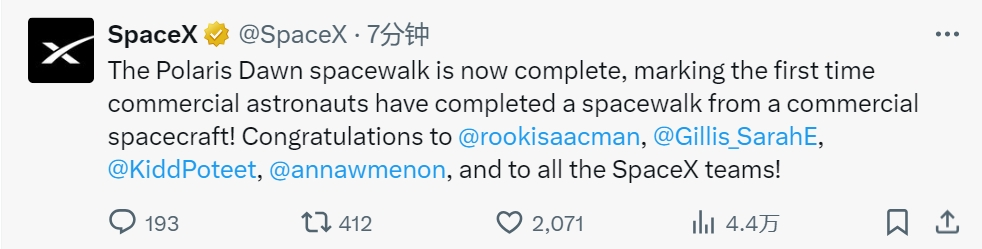 SpaceX发文表示,“‘北极星黎明’商业太空行走任务已完成,标志着商业宇航员首次从商业飞船上完成太空行走了。”