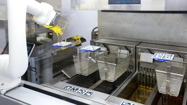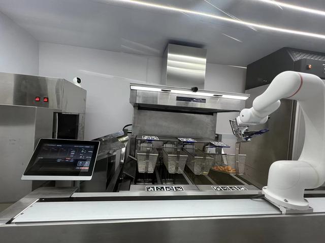“来,尝尝机器人大厨做的饭。”享刻智能公司创始人兼CEO陈震带记者近距离接触刚刚“持证上岗”的智能机器人大厨。在电子显示屏上选择“薯条”选项后,再轻击下单按钮,炸锅前的智能机器人大厨立刻被“唤醒”。只见它伸手抄起一个金属炸篮,顺畅滑动到落料口处,自动称重好的冷冻薯条随之落入篮内。预热油锅、炸制薯条、控温沥油……机器人有条不紊地在油锅前忙活着。看着热油中翻滚的薯条逐渐变成金黄色,机器人麻利地将炸熟的薯条从油锅中一把捞出。两分多钟,一盘薯条便从出餐口的传送带上送出来,外酥里嫩、味道可口。