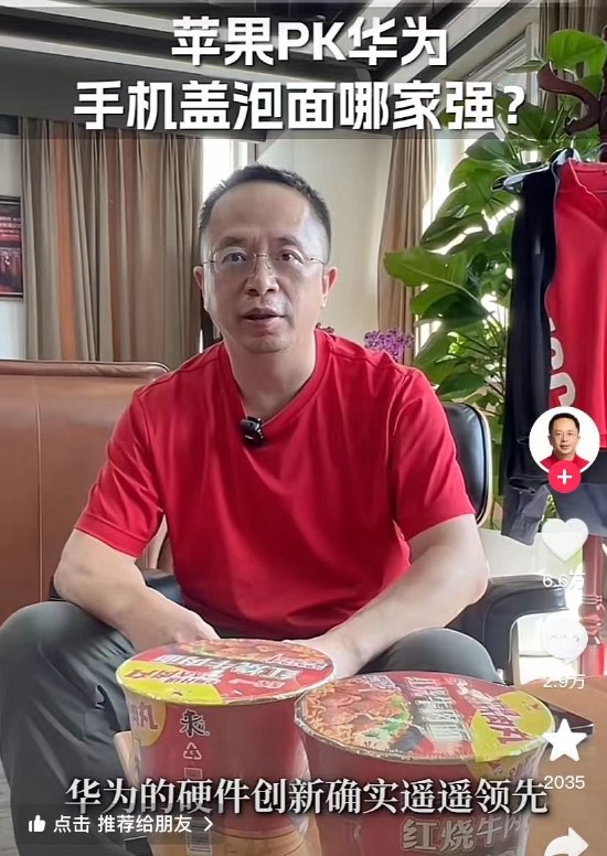 他还表示,“工作忙的时候吃泡面,手机很重要的功能就是要压住泡面盖,如果同时吃两盒泡面,手机是很难压住两个泡面盖的,只能一碗一碗的泡,可是有了华为Mate XT就会不一样,同时能够盖住两碗泡面,吃泡面的效率提高了一倍,压得更坚实一点,所以坚决不买iPhone16。”