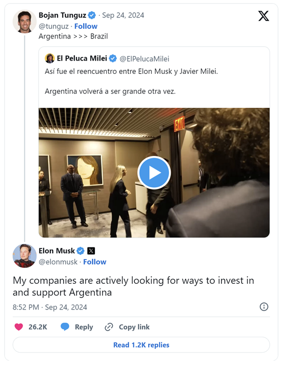 “我的公司正在积极寻找投资和支持阿根廷的方式,”马斯克在回复中写道。