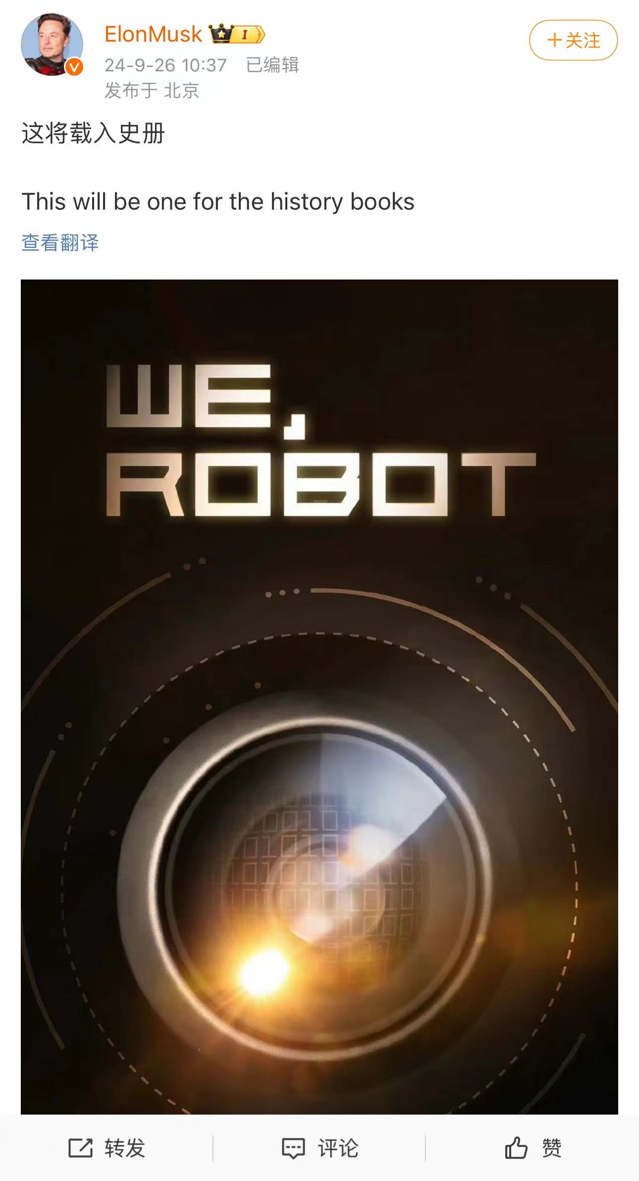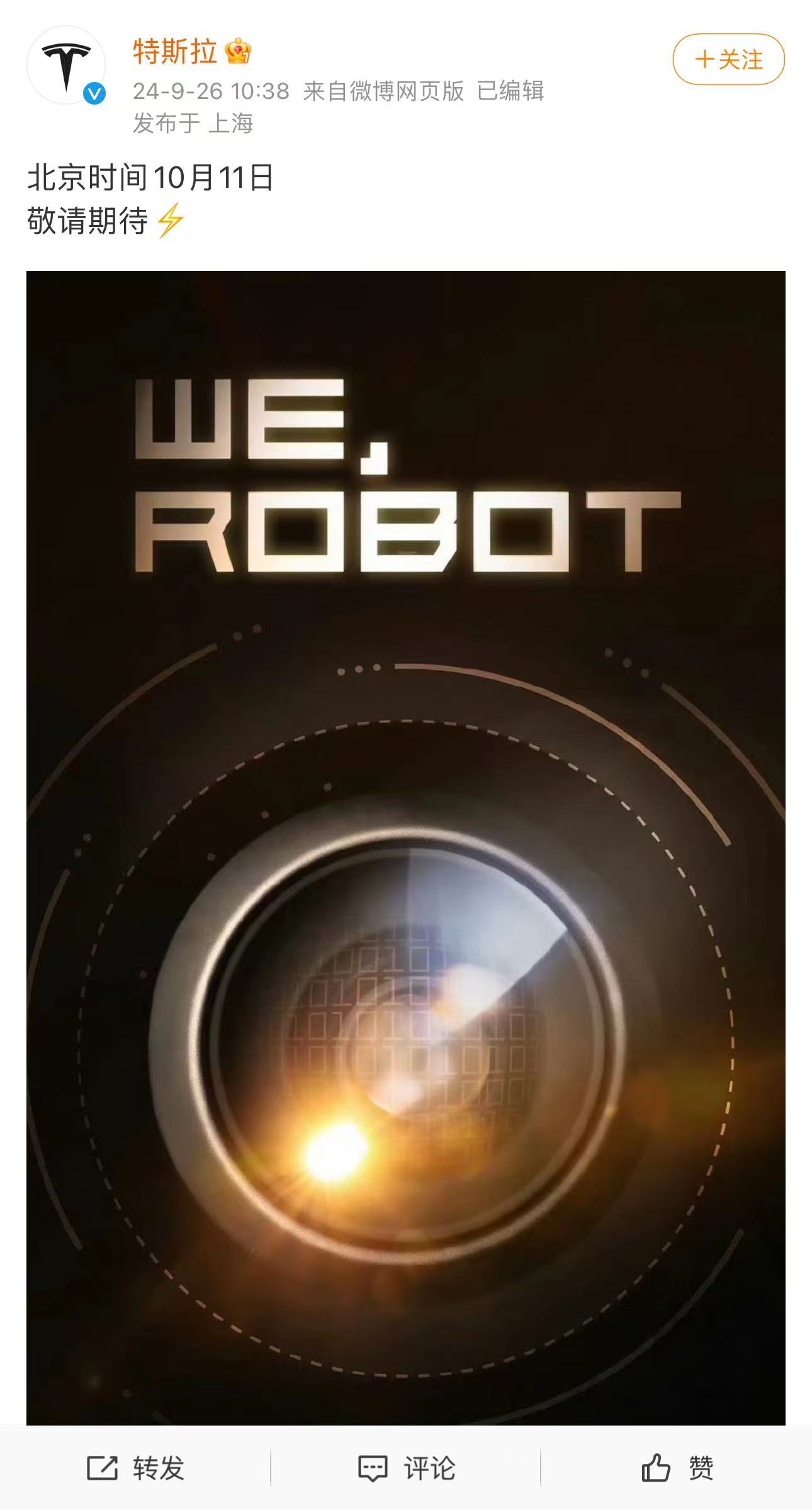 今日,特斯拉官方及埃隆•马斯克在微博发布活动预热海报,将于北京时间10月11日在美国洛杉矶发布新品,活动主题口号为“We, Robot”(我们,机器人)。马斯克更高调宣称,“这将载入史册”。