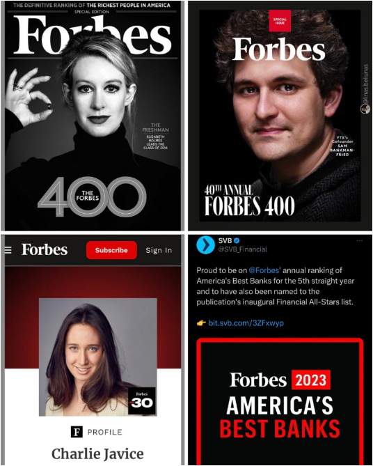 这些被《福布斯》年轻精英榜钦定的骗子名单包括:数据造假欺骗投资者的血液检测公司Theranos创始人霍尔姆斯(Elizabeth Homes)、挪用百亿美元客户资金的加密货币交易平台FTX创始人班克曼、将治疗弓形虫的救命药物价格哄抬50倍的对冲基金经理什克利(Martin Shkreli)、广告造假没有技术却上市融资的氢能源汽车Nikola创始人米尔顿(Trevor Milton)、伪造数百万用户诈骗摩根大通2亿美元的金融创业者查莉·贾维斯(Charlie Javice)。