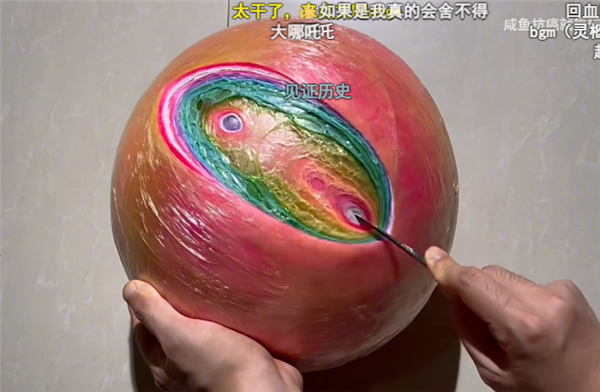 其实,盘子上的皮是 up 主涂上去的,用胶水和闪粉,风干后就会形成这样一层薄薄的皮,用镊子等工具可以完整的撕下来。