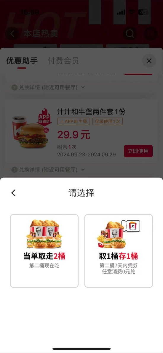 肯德基官方对此未予置评。肯德基客服向新浪财经表示,第二桶需要任意消费领取,外送费和打包服务费不计入任意消费或整单优惠金额,在券兑换详情中对规则有详细说明。