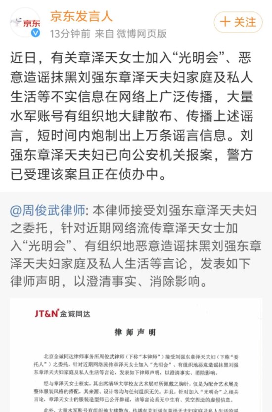 10月16日上午消息,京东发言人官方微博发布内容称:近日,有关章泽天女士加入“光明会”、恶意造谣抹黑刘强东章泽天夫妇家庭及私人生活等不实信息在网络上广泛传播,大量水军账号有组织地大肆散布、传播上述谣言,短时间内炮制出上万条谣言信息。刘强东章泽天夫妇已向公安机关报案,警方已受理该案且正在侦办中。