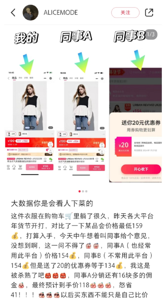 不过,在小红书“唯品会杀熟”相关讨论帖内,类似结论并不适用所有用户。一位用户称自己、同事A、同事B的唯品会SVIP显示同一件商品的价格都不相同,而自己的SVIP比另外两个同事的价格都要高,但同事A也属于经常使用唯品会的人,而同事B由于不经常使用,获得了20元全场券实现了更低的价格。对此,网友吐槽总结:“经常用,用得多,反而没有券。”