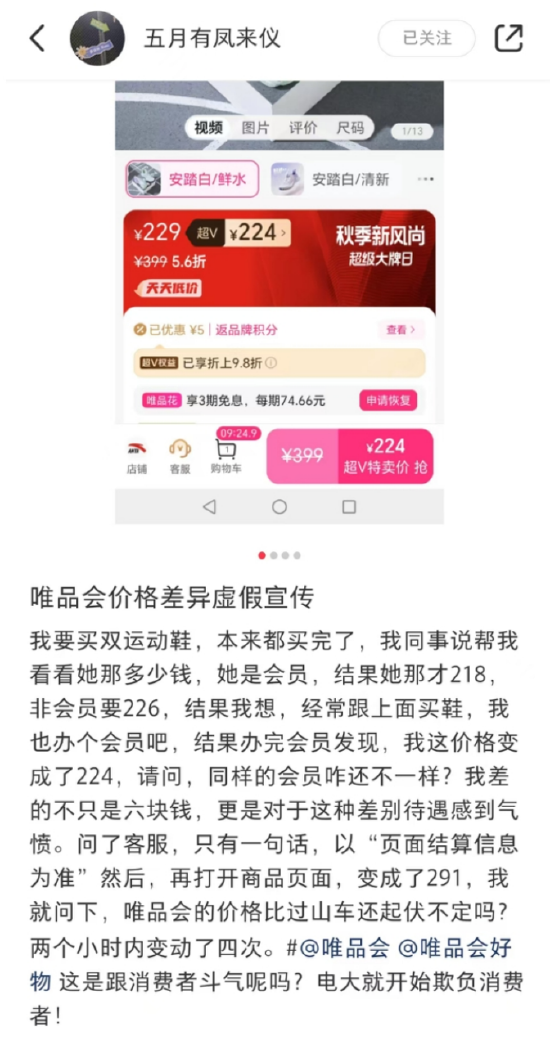 近日,有网友在社交平台反映,自己在唯品会上买双运动鞋,同事作为SVIP会员显示的价格是218元,而非会员价格是226元。于是该网友充值了唯品会会员,结果看到显示的价格是224元。