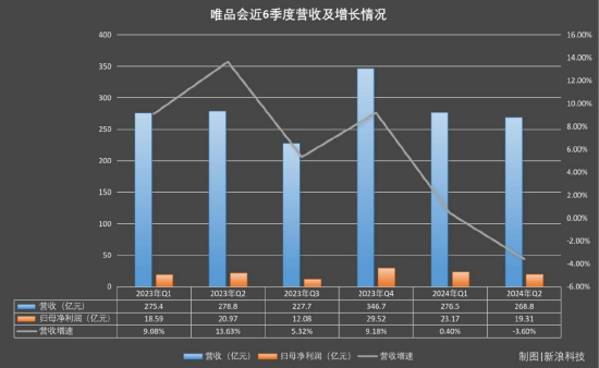 该季度,唯品会净营收268.8亿元,上年同期为278.8亿元,同比下降3.60%;归属于股东的净利润为19.31亿元,上年同期为20.97亿元,同比下降7.93%;此外,订单总数为1.978亿,上年同期为2.138亿,同比下降8.1%;活跃客户数量为4430万,上年同期为4570万,同比下降3.06%。