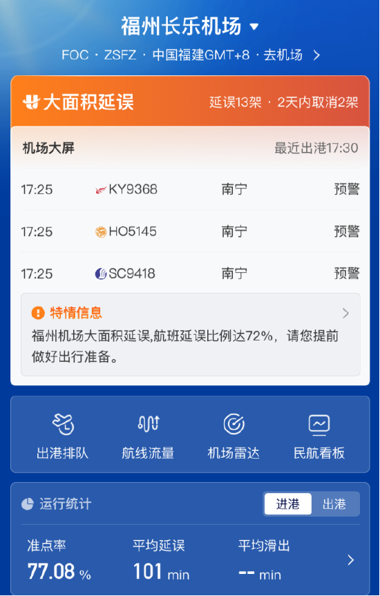 10月21日下午消息,有乘客反映称,有多个飞往福州机场的航班备降厦门机场。航旅纵横数据显示,福州长乐机场目前是大面积延误状态,已经延误13架,2天内取消2架,航班延误比例达72%,进港平均延误101分钟。