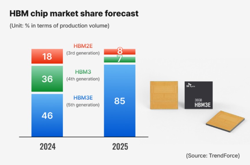 Wu表示,在HBM产品中,第五代HBM芯片HBM3E的份额预计将从今年的46%增加到2025年的85%,主要由英伟达的Blackwell GPU推动。