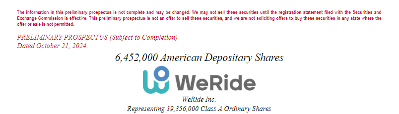 根据路透社周三看到的一份条款文本,中国自动驾驶初创公司WeRide(文远知行)已申请在纳斯达克首次公开发行1.194亿美元的股票,并定向发行3.205亿美元。作为此次IPO的一部分,这家总部位于广州的公司将发行 650 万股美国存托股票,每股价格区间为 15.5 美元至 18.5 美元。