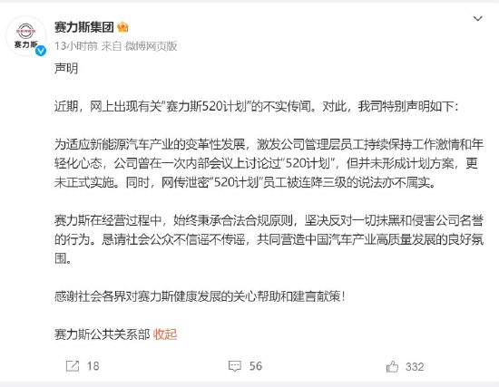 10月30日上午消息,赛力斯发布声明称,近期,网上有关“赛力斯520计划”的传闻不实。赛力斯称,为适应新能源汽车产业的变革性发展,激发公司管理层员工持续保持工作激情和年轻化心态,公司曾在一次内部会议上讨论过“520计划”,但并未形成计划方案,更未正式实施。