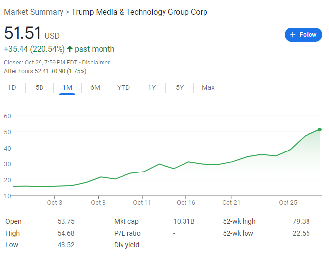 随着美国大选日临近,选情不确定性日益加剧,DJT股价本月以来已累计上涨220%,创下三年来最大月度涨幅。