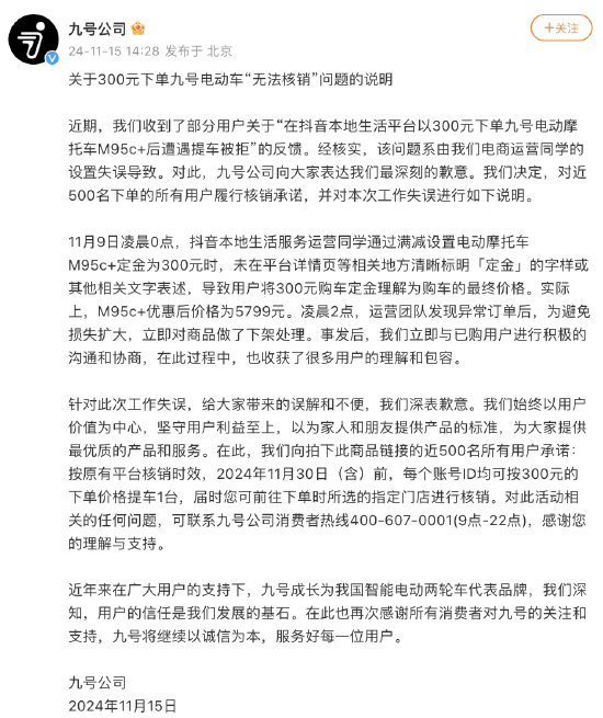 今日,九号科技公司官方发文回应称,“近期,我们收到了部分用户关于在抖音本地生活平台以300元下单九号电动摩托车M95c+后遭遇提车被拒的反馈。经核实,该问题系由我们电商运营同学的设置失误导致。对此,九号公司向大家表达我们最深刻的歉意。我们决定,对近500名下单的所有用户履行核销承诺,并对本次工作失误进行如下说明。
