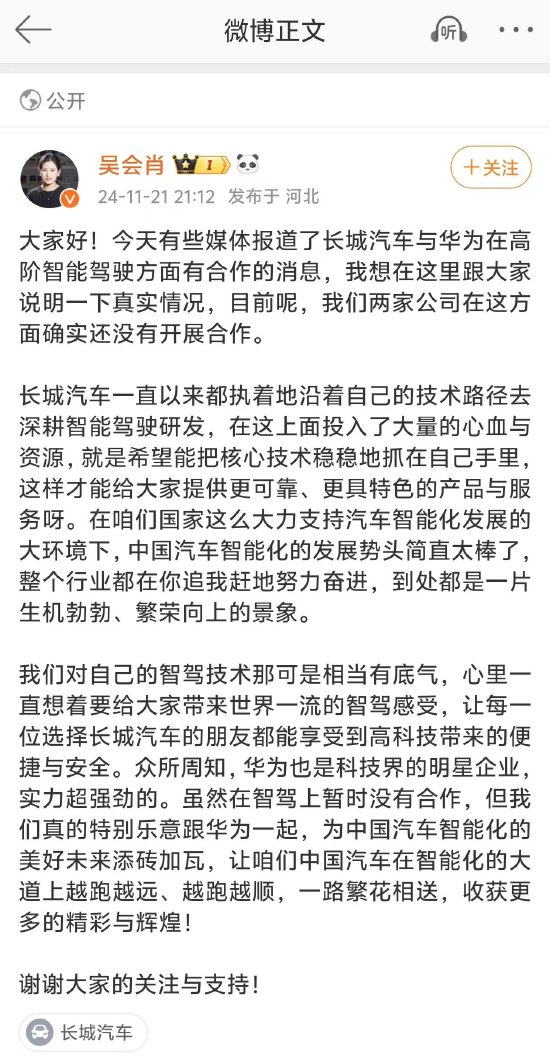 大家好!今天有些媒体报道了长城汽车与华为在高阶智能驾驶方面有合作的消息,我想在这里跟大家说明一下真实情况,目前呢,我们两家公司在这方面确实还没有开展合作。