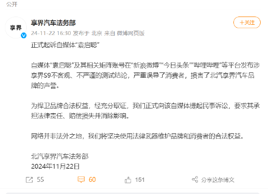 华为与北汽合作的享界汽车法务部今日于微博发文宣布,将正式起诉自媒体“袁启聪”。据悉,自媒体“袁启聪”及其相关矩阵账号在“新浪微博”“今日头条”“哔哩哔哩”等平台发布涉享界S9不客观、不严谨的测试结论,严重误导了消费者,损害了北汽享界汽车品牌的声誉。