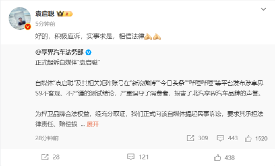 对于被华为享界汽车法务部提起民事诉讼一事,资深车评人袁启聪今日通过微博回应称,“积极应诉,实事求是,相信法律”。