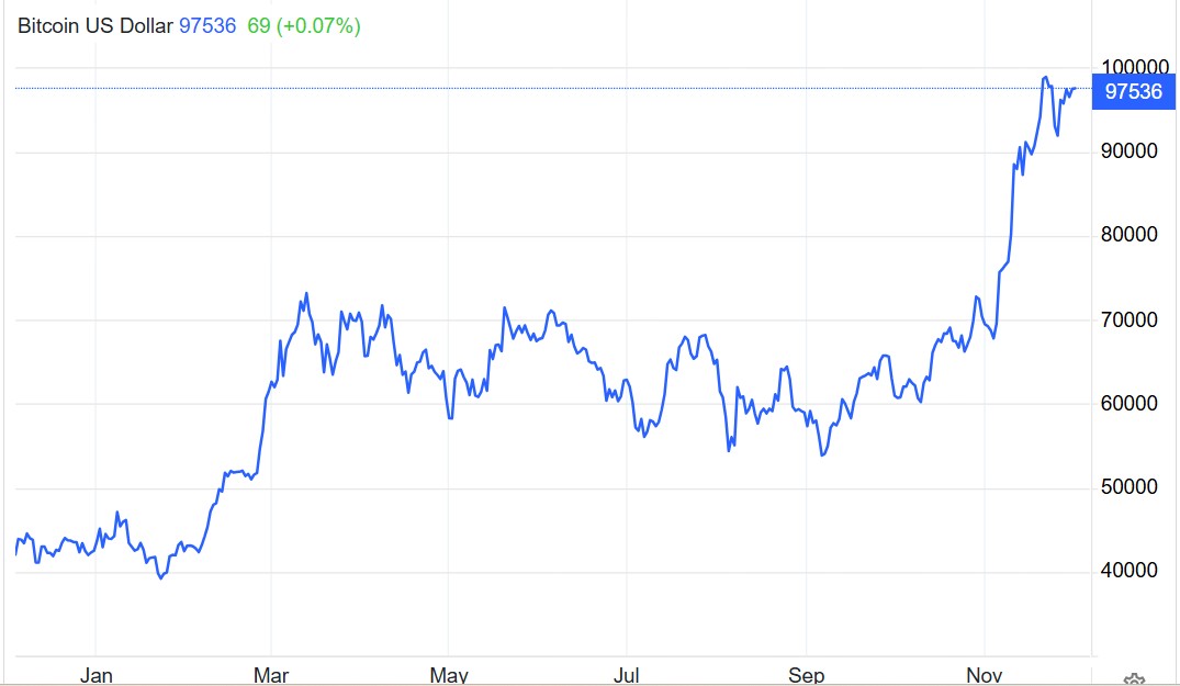 加密货币市场的领头羊比特币在上周一度逼近10万美元史诗级大关,但随后有所回落,当前比特币的交易价格徘徊在97,500美元附近。