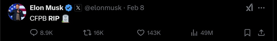 马斯克也在社交媒体X上发帖称:CFPB RIP。意为美国消费者金融保护局一路走好。