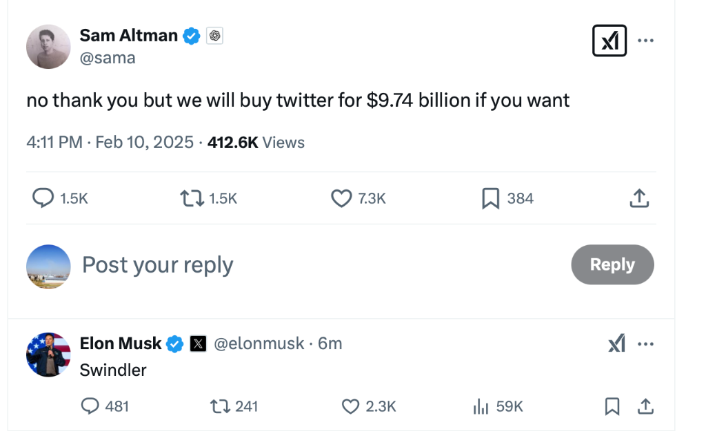 面对这一突如其来的收购要约,Altman在社交媒体平台X上迅速回应,表示拒绝,并调侃称:“不用了,谢谢,但如果你愿意的话,我们可以用97.4亿美元收购推特。” 马斯克则立刻回击:“骗子。”