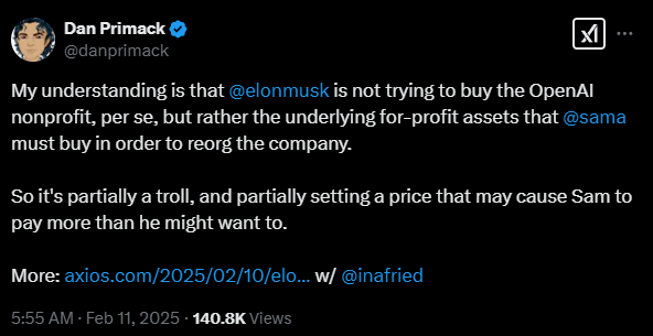 Axios财经编辑 Dan Primack在社交媒体上指出,马斯克此举并非真的要直接收购OpenAI的非营利实体,而是瞄准了 Altman 为了重组公司而必须购买的营利性资产。