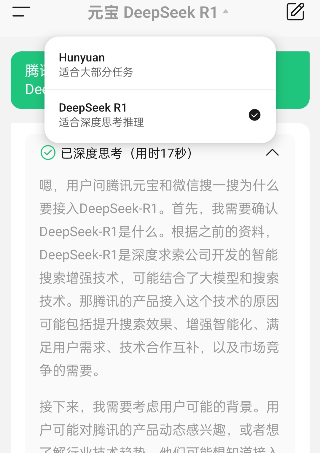记者留意到,腾讯系产品中,腾讯云AI代码助手、腾讯元宝APP也接入了DeepSeek-R1。记者在元宝APP看到,用户既能选择“适合大部分任务”的腾讯混元大模型,也能选择“适合深度思考推理”的DeepSeek-R1。