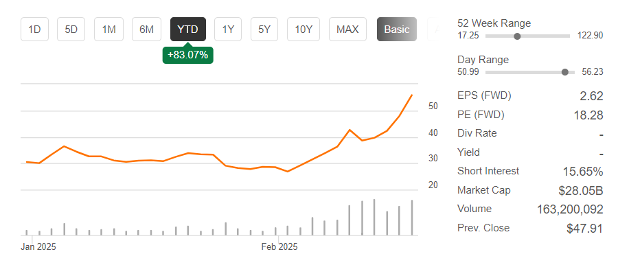 该公司股价已较2月3日收盘价26.31美元翻了一番。仅在过去五个交易日内,股价就上涨了约40%,此前该公司公布了初步的第二季度财务业绩和展望。自去年11月中旬收盘价18.01美元以来,股价已接近翻了三倍。