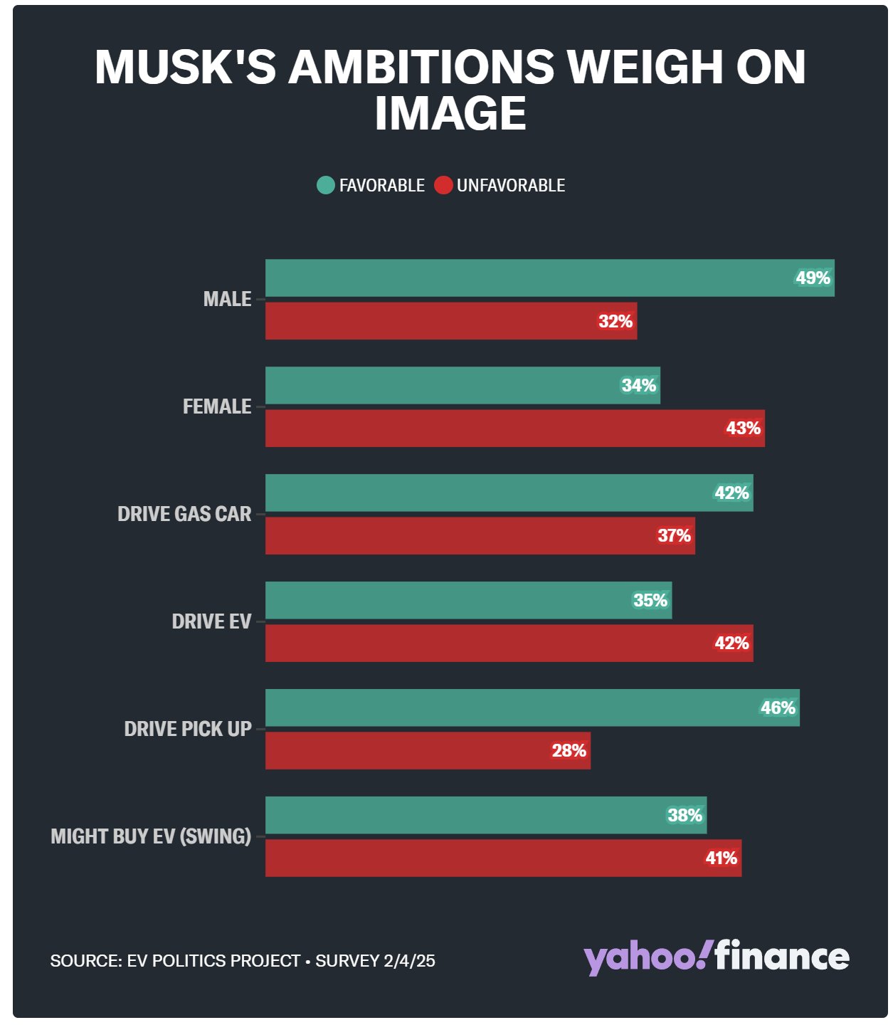 美国电动汽车就业联盟最近进行的一项民意调查显示,电动汽车司机对马斯克的正面评价为35%,对他的负面评价为42%。他在女性受访者中的地位分歧更大(34%赞成,43%反对)。