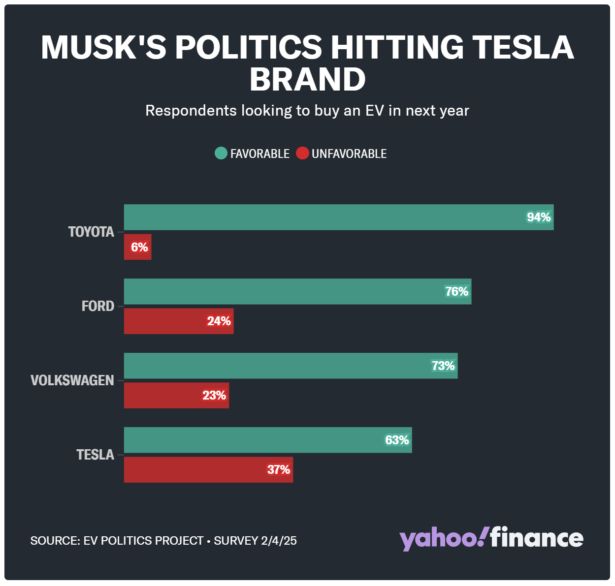 该调查调查了潜在电动汽车买家对品牌的看法。在电动汽车竞争对手福特、丰田和大众中,特斯拉的好感度最低(63%),而负面评价最高(37%)。