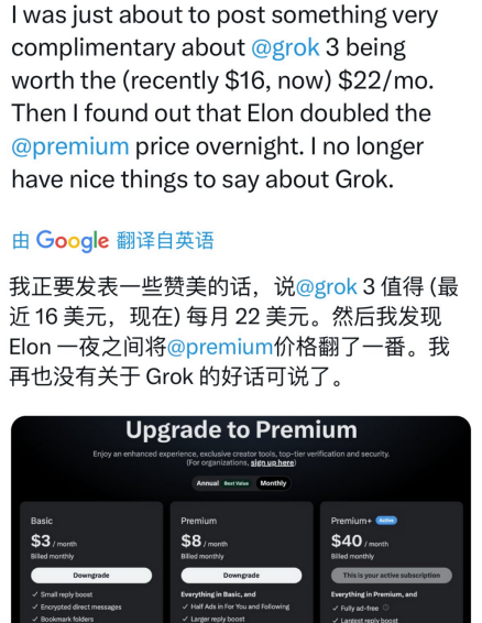 一天前还说Grok 3首先让Premium +用户享受上,马斯克甚至在发布会上鼓励大家感兴趣的话去开通订阅服务。结果一转眼价格几乎翻倍?就挺突然的,也挺不讲武德的。
